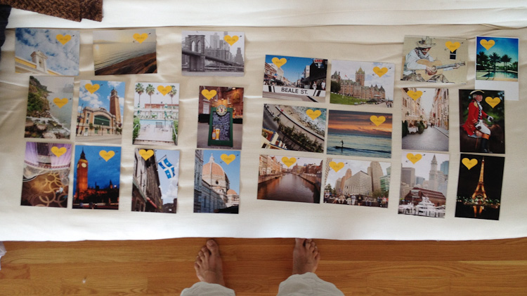 Of course, what’s a trip without photos?!?! We decided to set the city names (using our standard Ostrich Sans font) in a small yellow heart icon, and float that on top of a photo from each of the destinations. Once all of the 23 cities were printed, we put them into 5x7” frames, trying to match the place with the frame. Good times, and I really think that everything came together nicely!