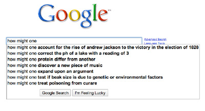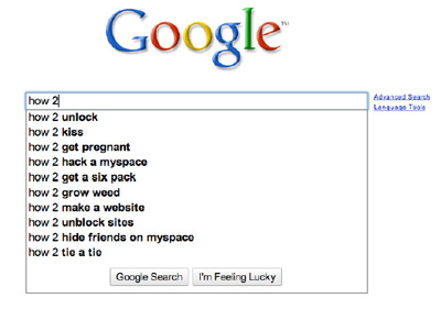 Slate Magazine recently asked readers to send in Google Suggest results for “less intelligent” versus “more intelligent” queries, like “how 2” vs “how might one.” They posted the results this week, and they reveal a hell of a lot about our search habits. There are quite a few gems in both Slate posts, but here are some of my personal faves.