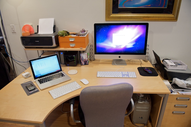 The new setup, finalized. 13" MacBook Pro and the 27" iMac Core i7, with storage provided by Drobo and LaCie external firewire drives. Networking is behind the MBP screen: Juniper SSG 5 and gigabit Apple Airport Extreme.