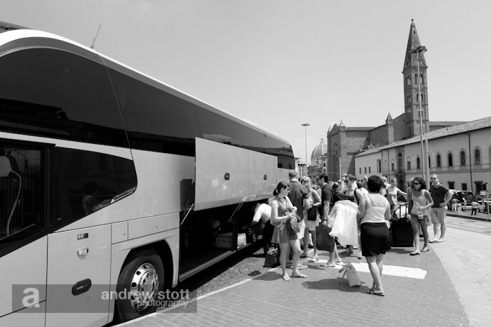 The wedding festivities started on Tuesday night with a fantastic rehearsal dinner at del Frescobaldi, right off the Piazza Signoria in Florence (photo above). Needless to say, the food and wine were amazing, and it was a wonderful opportunity to meet the other wedding guests and start forming those shared experiences. After dinner, the guys and girls split up for a bachelor and bachelorette party, respectively. A couple bars later, the guys had enjoyed a few too many shots, and the girls had partaken in a few too many bottle of prosecco, but it was all for a good cause. The next morning, everyone met at the Florence train station to board busses (photo below) for the short trip to Tuscany, specifically the Chianti region. Let's just say it was a rougher ride for some, but we're all glad that we weren't driving!