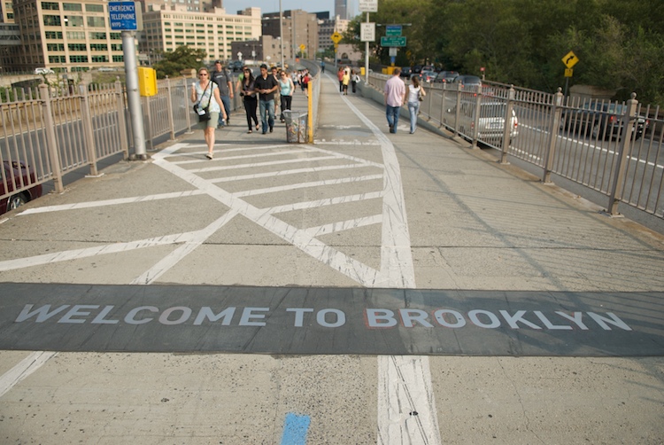 After a mile-long walk across the Brooklyn Bridge, a big "welcome" greets pedestrians.
