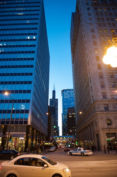 Looking west down Adams Street at dusk, from the steps of the Art Institute of Chicago.